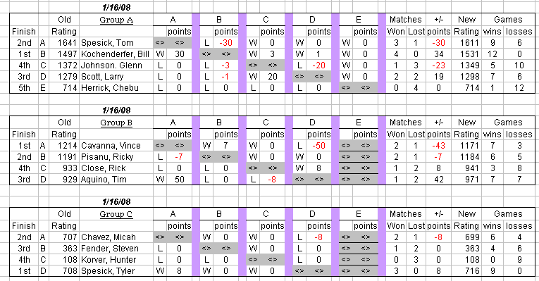 hi all, on �monday evenings, there will be a donation jar at the sign in desk. the contents of which will be donated to local school(s) in form of a ping-pong table or other, depending on the generosity of the club members. the community thru ard provides a place for us to play at a reduced cost, so this is one way we can give a little back to the community.� also on mondays, we want to wipe down all tables before play. see bob grittner, ron mallory or bill indreboe to assist in this task. this procedure will prolong the life of the balls and the table plus the rubber on your paddles. if on a wednesday evening, you think you will be late, please call bill (916) 275-0899, or myself (530) 878-2602. if you reach us, we will put you on a table. congratulations to group winners 1/30/2008: tom spesick, tyler spesick and eric stefanic