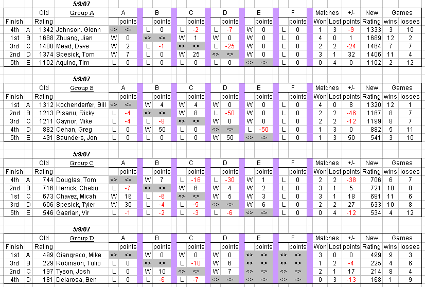 hi all, please note that the club will be closed this monday, memorial day. please refer to our website for questions about club operating days. several of our members competed in the recent tournament in sacramento. congratulations to tyler spesick for his first place finish in the under 750 singles event and to him and tom spesick for their 2nd place finish in the under 2500 doubles. did anyone see the auburn journal for 5/17? there was a good action photo of micah chavez and a short article on the club and it�s 2nd anniversary.� please check the locking mechanism before attempting to fold up a table. although, the locks are not usually set, they may slide into partial position. to participate in wednesday play, it is critical to arrive and sign in prior to 7:00 pm.� also to prevent unnecessary loss of time, if you desire not to play in the round robin please inform me or my designate before 7:00 pm. if on a wednesday evening, you think you will be late, please call tim (530) 878-2602 or greg (530) 878-0170, if you reach us, we will put you on a table.� congratulations to group winners, j.z., tim aquino and tyler spesick.