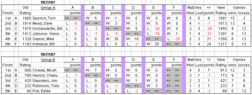 our traditional round robin wednesday evening events were suspended on october 24, 2007, for a team table tennis night, crafted by bill indreboe and larry scott, where all players in attendance were split up in to two evenly matched teams. the teams were blue and orange. all of the players on the orange team played all of the players on the blue team (and the blue team members played all the orange team members), best 2 out of 3. the event was informally handicapped. no rankings were impacted. our crack staff of retired mit numerologists have compiled the results of this event, and have determined that the orange team indeed prevailed. no coincidence that bill indreboe and larry scott were both orange team members, and no coincidence that the only scoresheets from the event were given to bill kochenderfer, also an orange team member, and no coincidence that the club website and email is managed by tom spesick, also an orange team member. it does pay to be on the team with clout. in fact, the "games won" tally was 77 for the blue (vince cavanna, tyler spesick, glenn johnson, jz, ken silva, jon saunders, dave mead and mike giangreco) and 59 games for the mighty orange team (bob grittner, tom spesick, larry scott, bill kochenderfer, bill indreboe, ron mallory, daniel silva and steve fender). however, there was an additional 20 tally points available to award based on sportsmanship and decorum, and all 20 were awarded to the orange team, resulting in a narrow 79 to 77 victory for the orange team. way to go, orangemen (and boys). your trophies are being sent ups. blue team, maybe next time. we return to regular round robin wed. oct. 31. open play monday oct. 29 as usual, of course. we look forward to seeing you!
